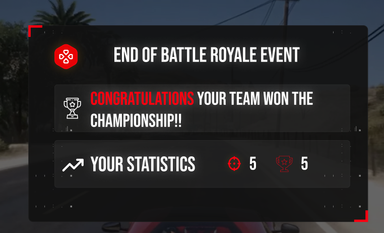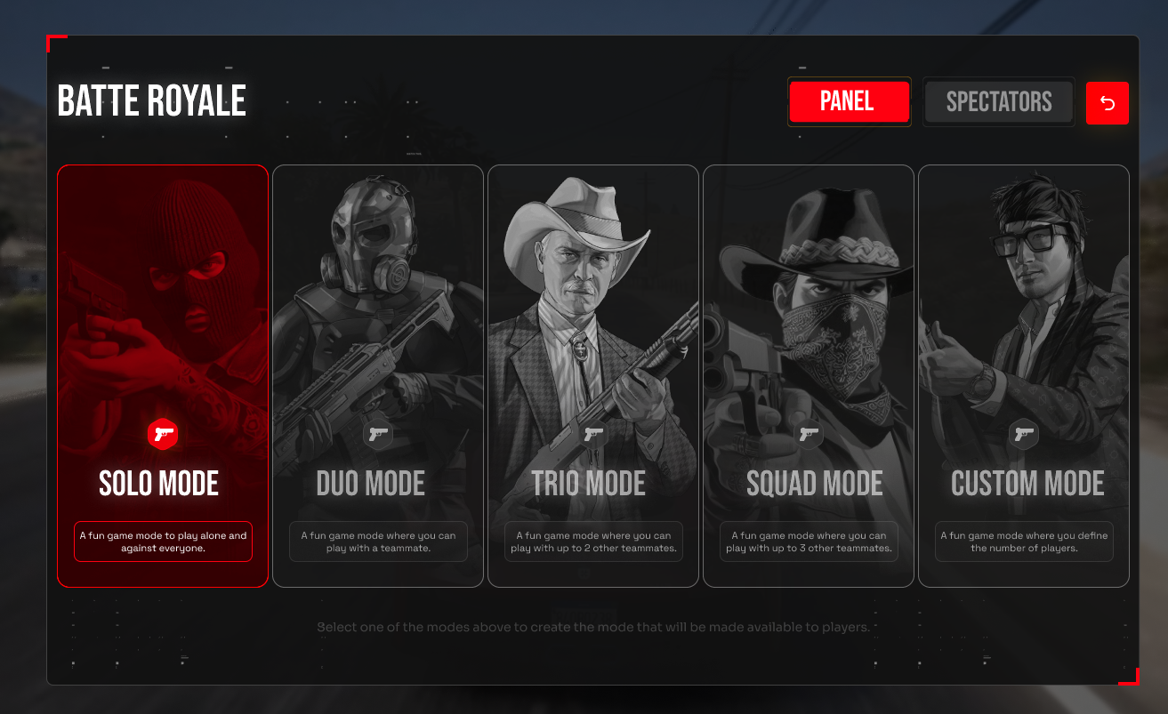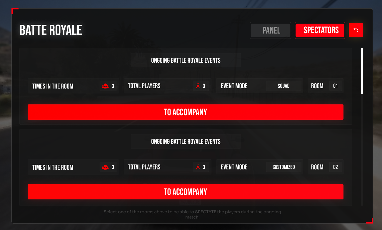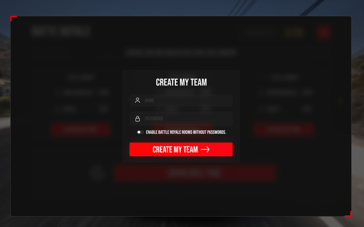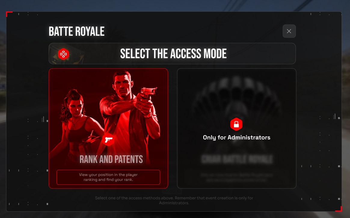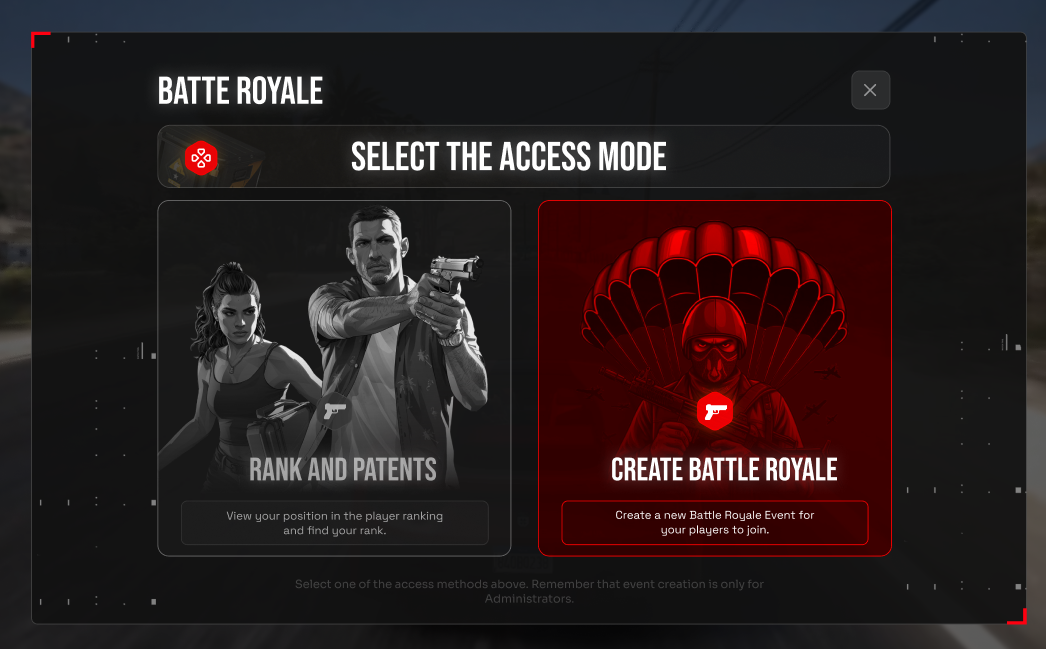 This first interface is accessible to all users. However, the CREATE BATTLE ROYALE section is only accessible to Administrators.
